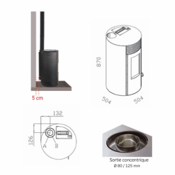 La sortie concentrique sur le dessus de diamètre 80/125 mm permet de mettre le poêle contre le mur (avec un mur anti feu ou plaque de protection) et assure une installation parfaitement esthétique.
