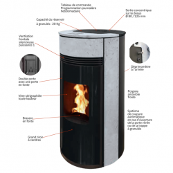 Équipe d’une double porte, sécurité totale. La première porte est en fonte avec une vitre plate, la seconde en verre est galbée et sérigraphiée sur toute la hauteur afin d’être en harmonie avec l’esthétique du poêle.